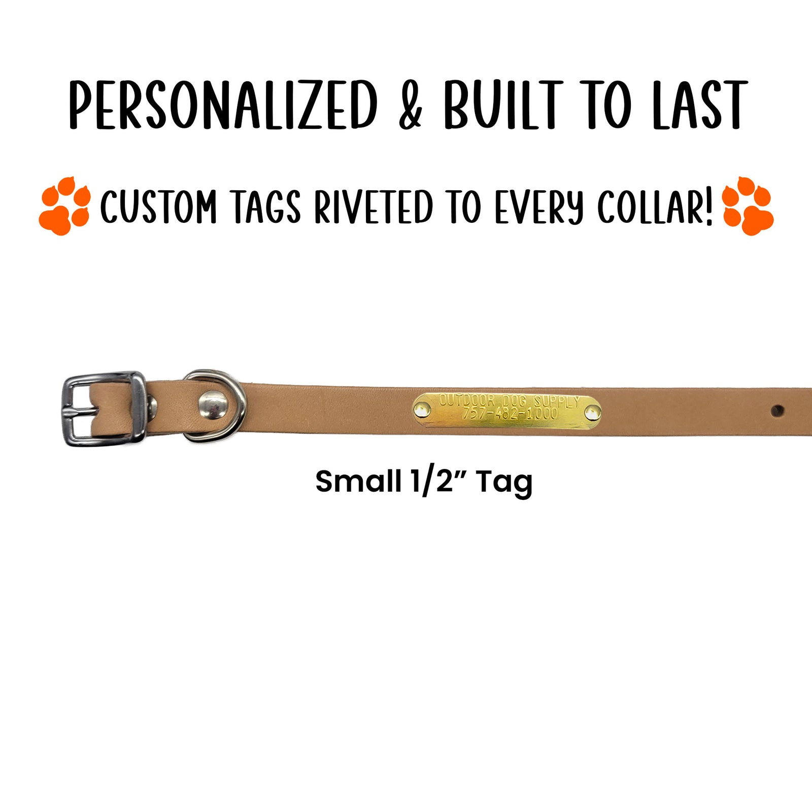 With each collar, you receive a complimentary brass nameplate that can be personalized with up to four lines of text. The raised lettering is designed to be clear and long-lasting, enduring through rough outdoor activities while remaining legible.