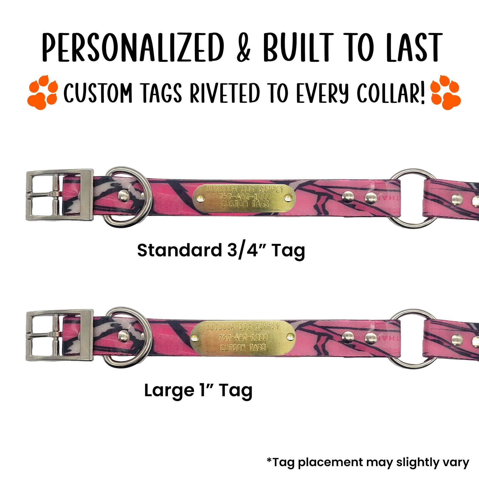 Customize your collar with a free brass name plate, ensuring your dog's safety with up to 5 lines of vital information. Designed to remain readable through years of use, our name plates can include your dog’s name, your contact information, and more. Note: Exposure to chlorine or salt water may affect the nickel-plated hardware. Colors may vary slightly due to screen settings. Perfect for all dogs, our collars combine practicality with personalized style.
