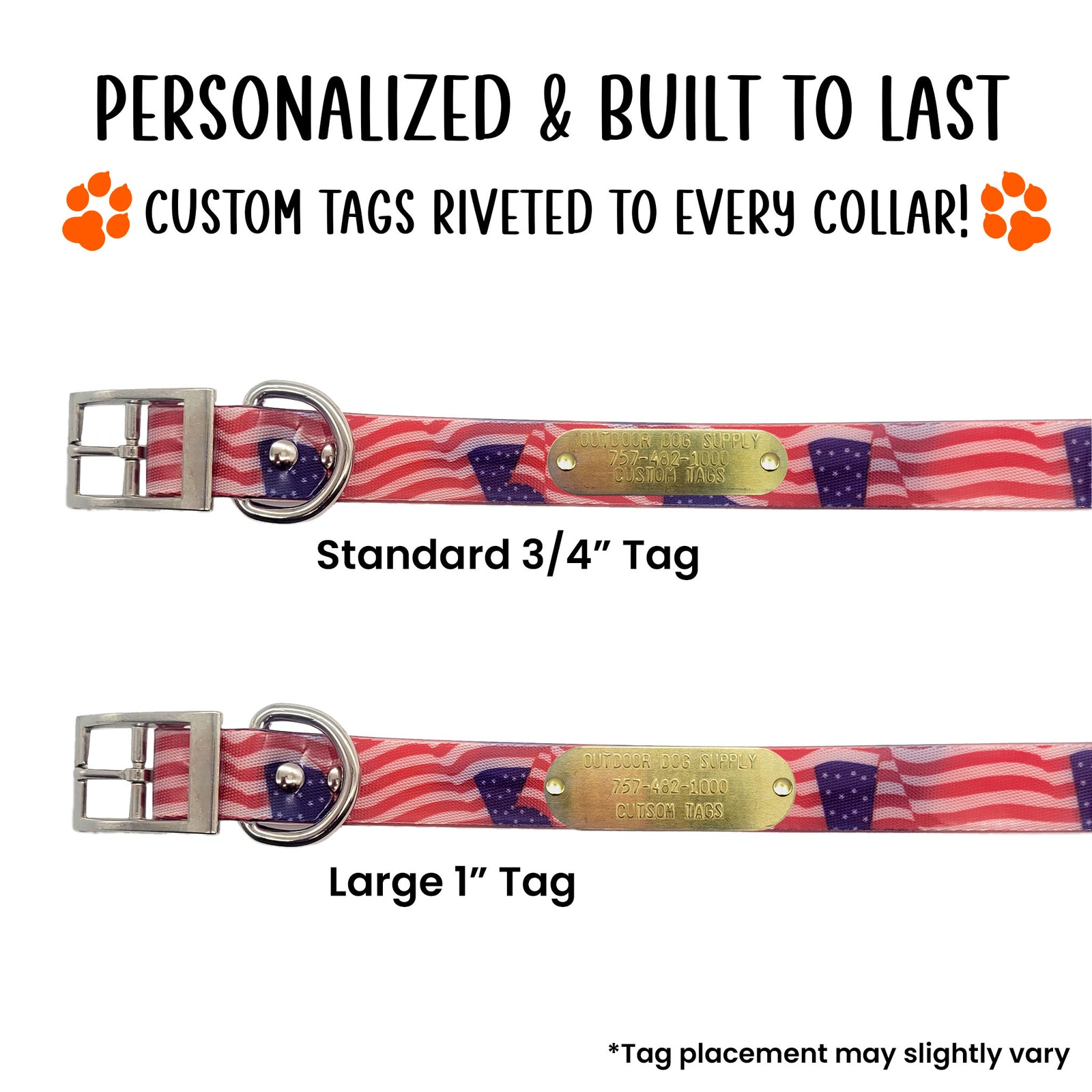 1" Premium Glow Tuff Dog Collars, perfect for any activity. Waterproof, odor-resistant, with a customizable brass name plate. Made in the USA.