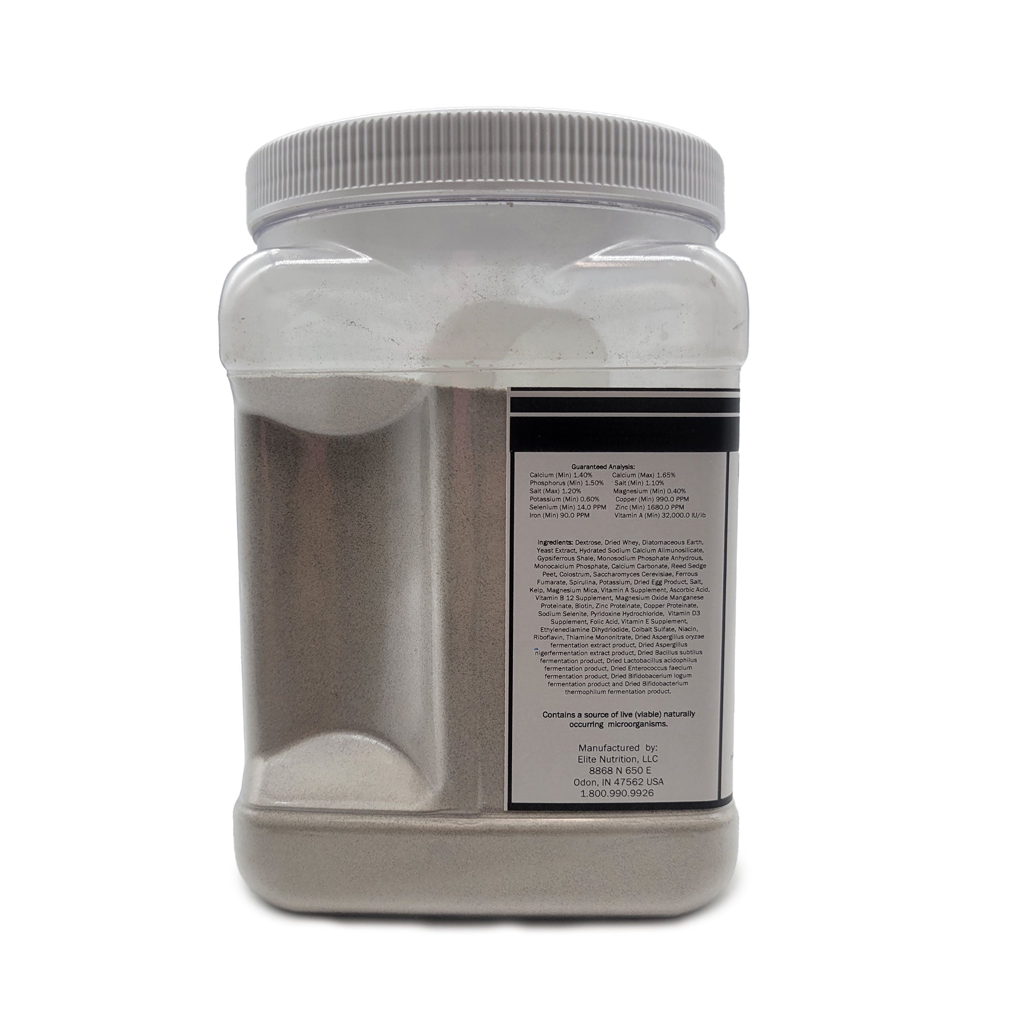 Dextrose, Dried Whey, Diatomaceous Earth, Yeast Extract, Hydrated Sodium Calcium Alimunosilicate, Gypsiferrous Shale, Monosodium Phosphate Anhydrous, Monocalcium Phosphate, Calcium Carbonate, Reed Sedge Peet, Colostrum, Saccharomyces Cerevisiae, Ferrous Fumarate, Spirulina, Potassium, Dried Egg Product, Salt, Kelp, Magnesium Mica, Vitamin A Supplement, Ascorbic Acid, Vitamin B 12 Supplement, Magnesium Oxide Manganese Proteinate, Biotin, Zinc Proteinate, Copper Proteinate, Sodium Selenite, Pyridoxine Hydrochloride, Vitamin D3 Supplement, Folic Acid, Vitamin E Supplement, Ethylenediamine Dihydriodide, Colbalt Sulfate, Niacin, Riboflavin, Thiamine Mononitrate, Dried Aspergillus oryzae fermentation extract product, Dried Aspergillus nigerfermentation extract product, Dried Bacillus subtilus fermentation product, Dried Lactobacillus acidophilus fermentation product, Dried Enterococcus faecium fermentation product, Dried Bifidobacerium logum fermentation product and Dried Bifidobacterium thermophilum fermentation product.