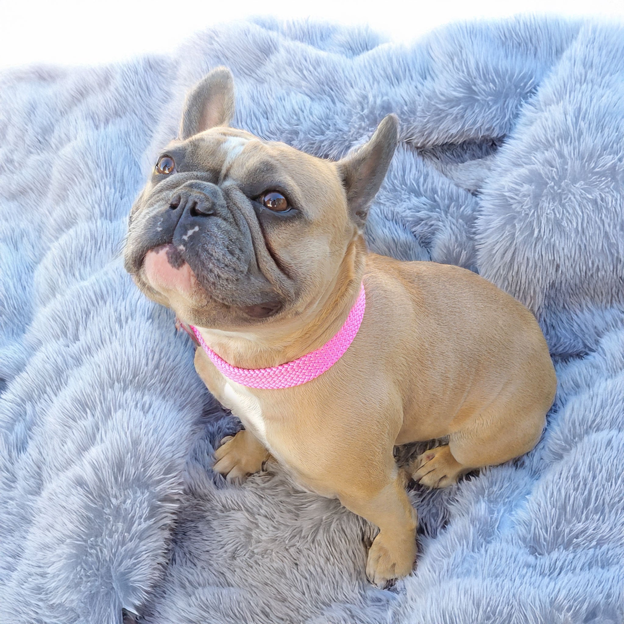 • Other Information: Princess Kiwi, a French bulldog with a sassy personality, struts through life with a flair for the dramatic. Her satin pink double-braided collar mirrors her vibrant charm—elegant yet playful. The soft satin feels luxurious, just like her love for fuzzy blankets, and the braids add a touch of fun that matches her feisty attitude. The collar is the perfect blend of sophistication and sass, just like Princess Kiwi herself: chic, bold, and always ready to steal the spotlight.