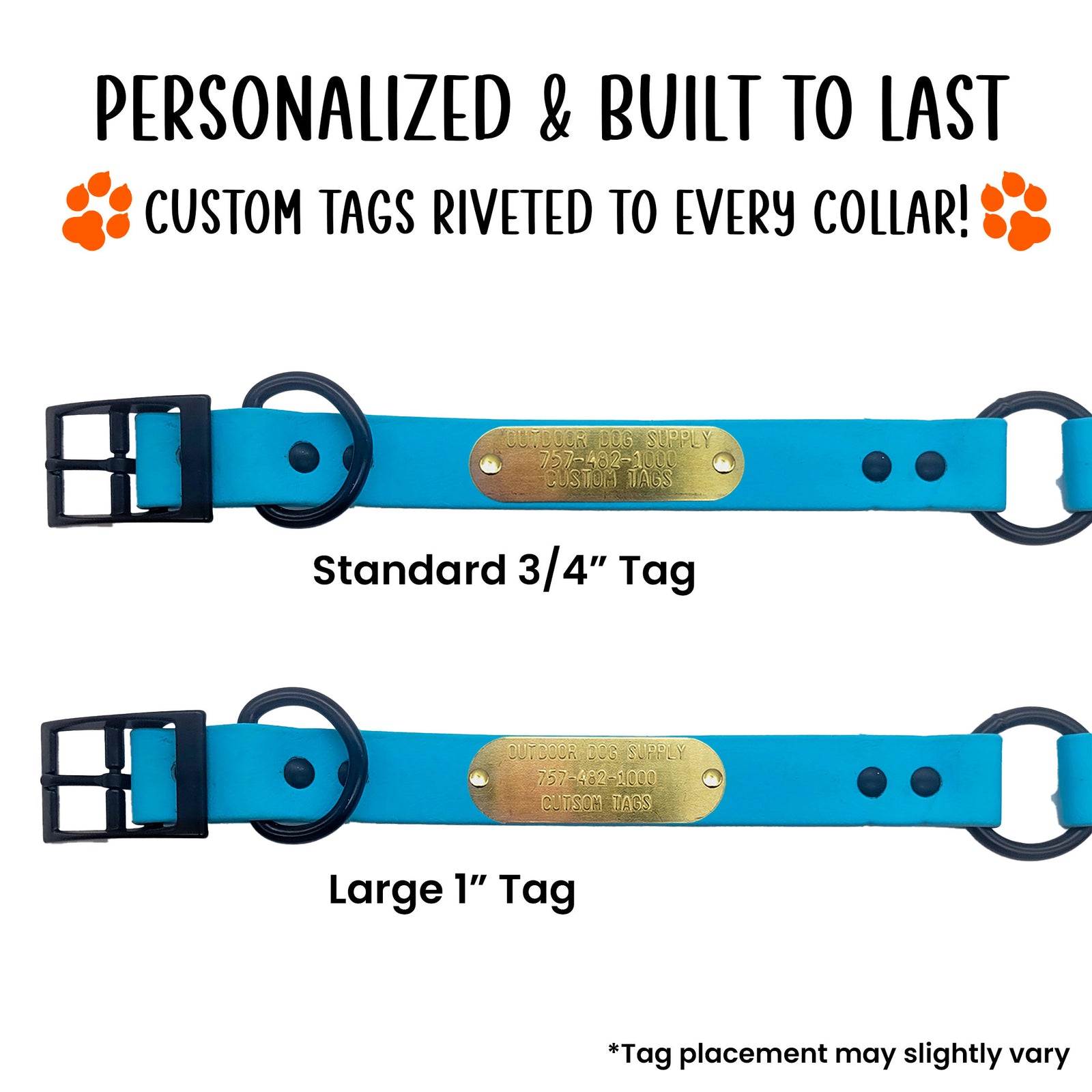 Each collar comes with a complimentary brass name plate that can be personalized with essential details such as your dog's name, your phone number, and more. The raised lettering is designed to remain legible through years of outdoor activity.