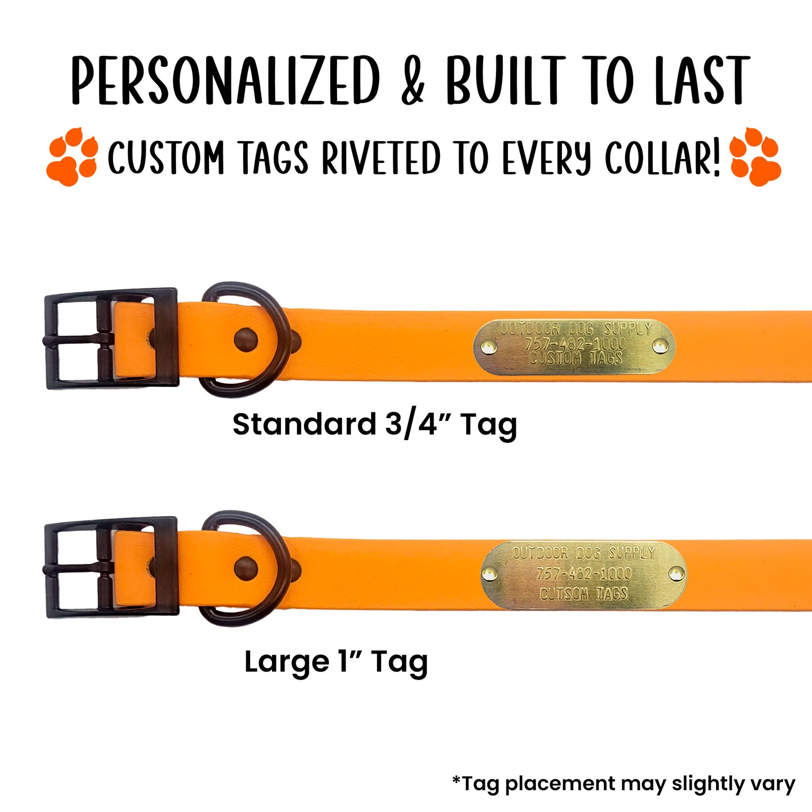 Enhance your dog’s collar with a free brass name plate, customizable with up to four lines of important information to keep your pet safe. The raised lettering is durable and designed to be legible for years, even under harsh outdoor conditions.